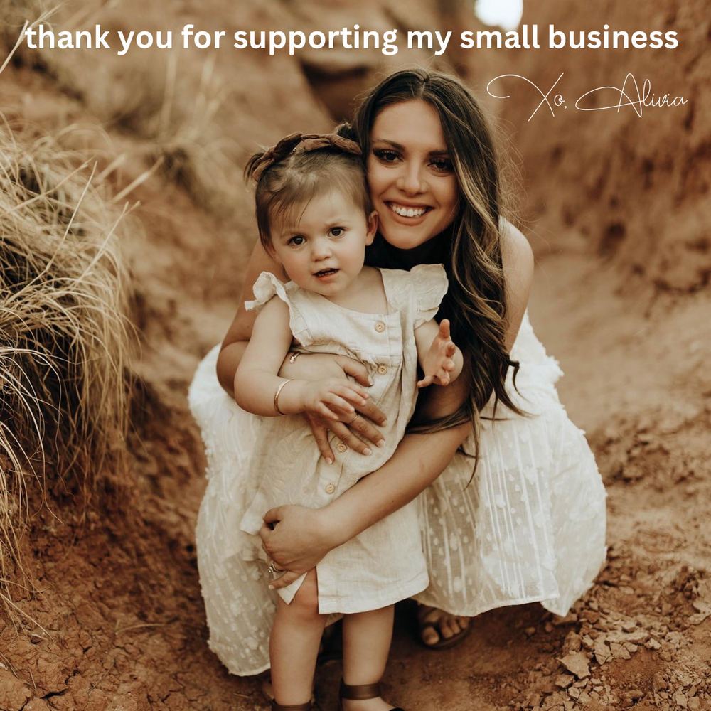 My name is Alivia. I am a mom of two. I took my love for kids + clothes and Peggi + Me was born. Behind Peggi + Me is a team of just me and my two little models. We don't have employees or a big wearhouse. All of your orders are packed with so much love right on our dining room table. We are the definition of a small business. So, THANK YOU for being here and showing us support! You are helping this small business grow. Xo, Alivia